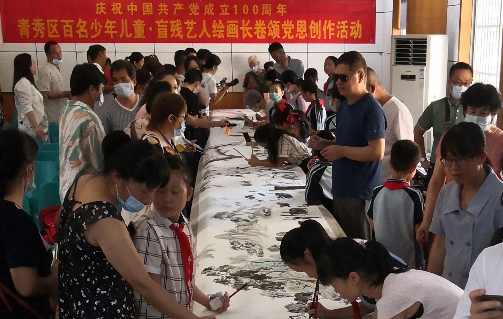 6月20日上午9点,南宁市青秀区残联、文联等单位联合在我馆举行百名少年儿童•盲残艺人颂党恩绘长卷“百牛奋进图”创作活动,喜迎建党100周年。活动现场,少年儿童们拿起毛笔在18米长的卷轴画卷前,描绘出一只只栩栩如生的牛,有的牛在奋力奔跑、有的牛在低头沉吟、有的牛在引吭长啸、有的牛则安静休憩,每一只牛都形态各异、风格万千。随后我馆在一楼阅览室展出了画卷。