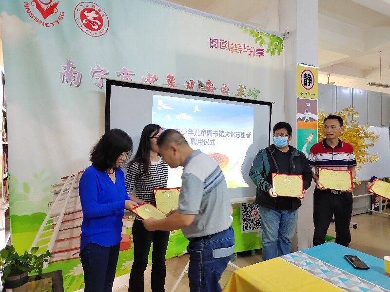 此次共聘任共录用了来自接力出版社的故事妈妈、原南宁市国际学校校长、海归人士、南宁二中学生等5名志愿者。任职期间,主要从事绘本阅读指导、科普读物分享、英文读物分享、思维导读指导课,他们将为我馆读者奉上一场场精彩纷呈的阅读活动。