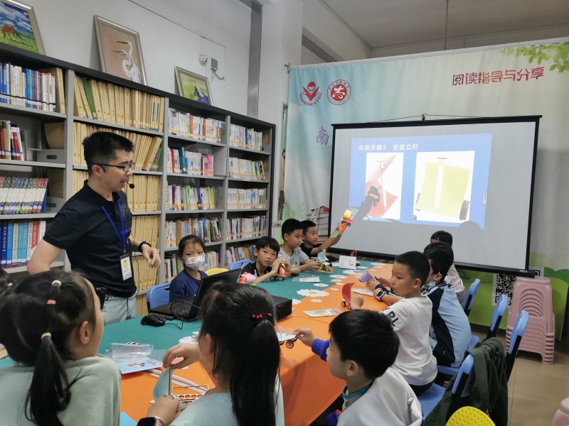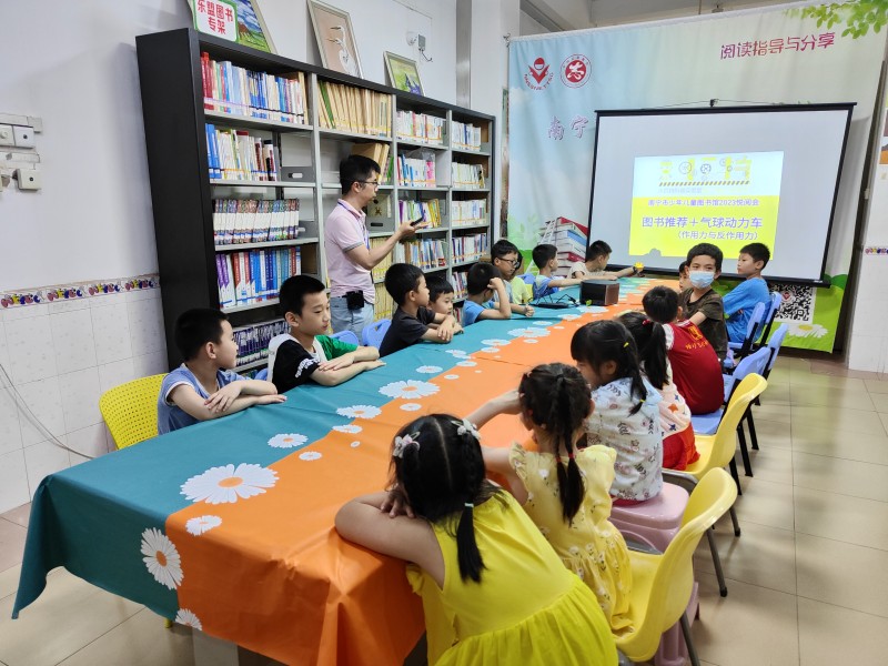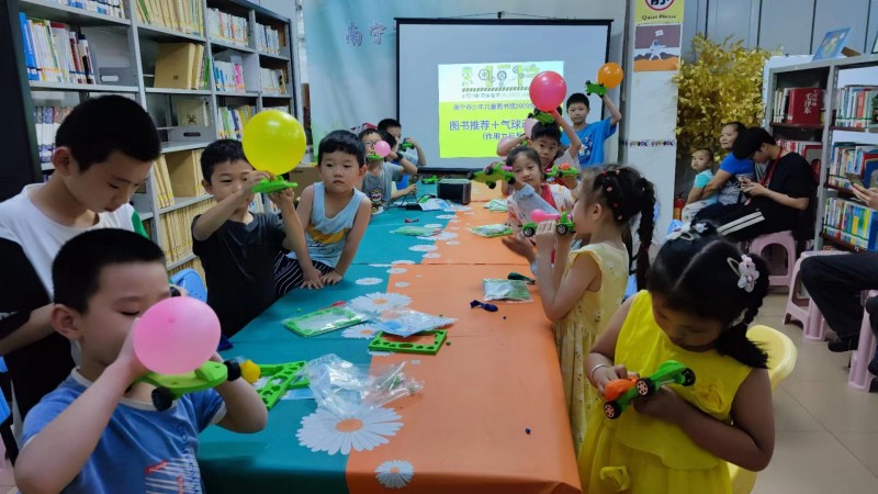 2023年5月28日少儿馆一楼悦阅会,游老师给大家讲述作用力和反作用里的原理,并根据这个原理制作气球动力车,小朋友们一吹气球,车子就咻地向前冲,太有意思了