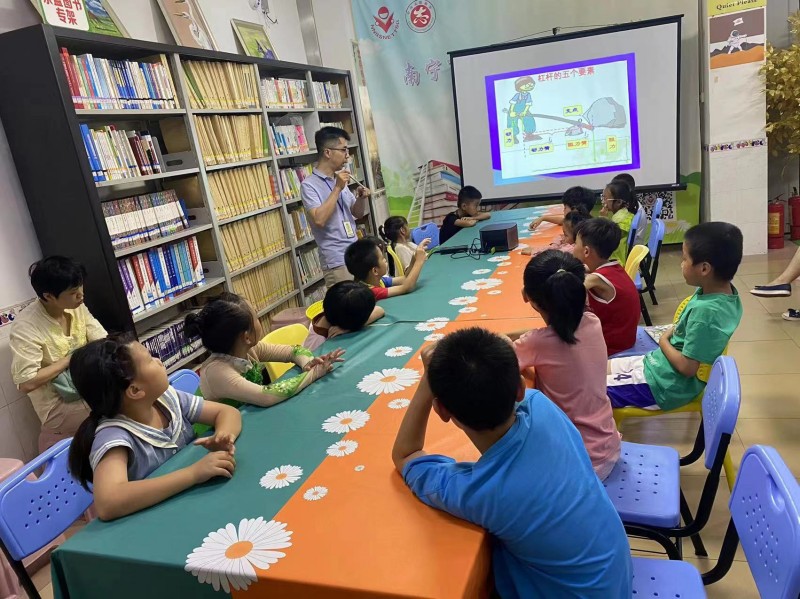 2023年6月4日少儿馆一楼悦阅会,游老师给大家讲述杠杆原理及应用,并通过手摇控制闸门起落,认识并了解道闸的作用,一起揭秘现实中闸道门的工作原理,15名孩子参与活动