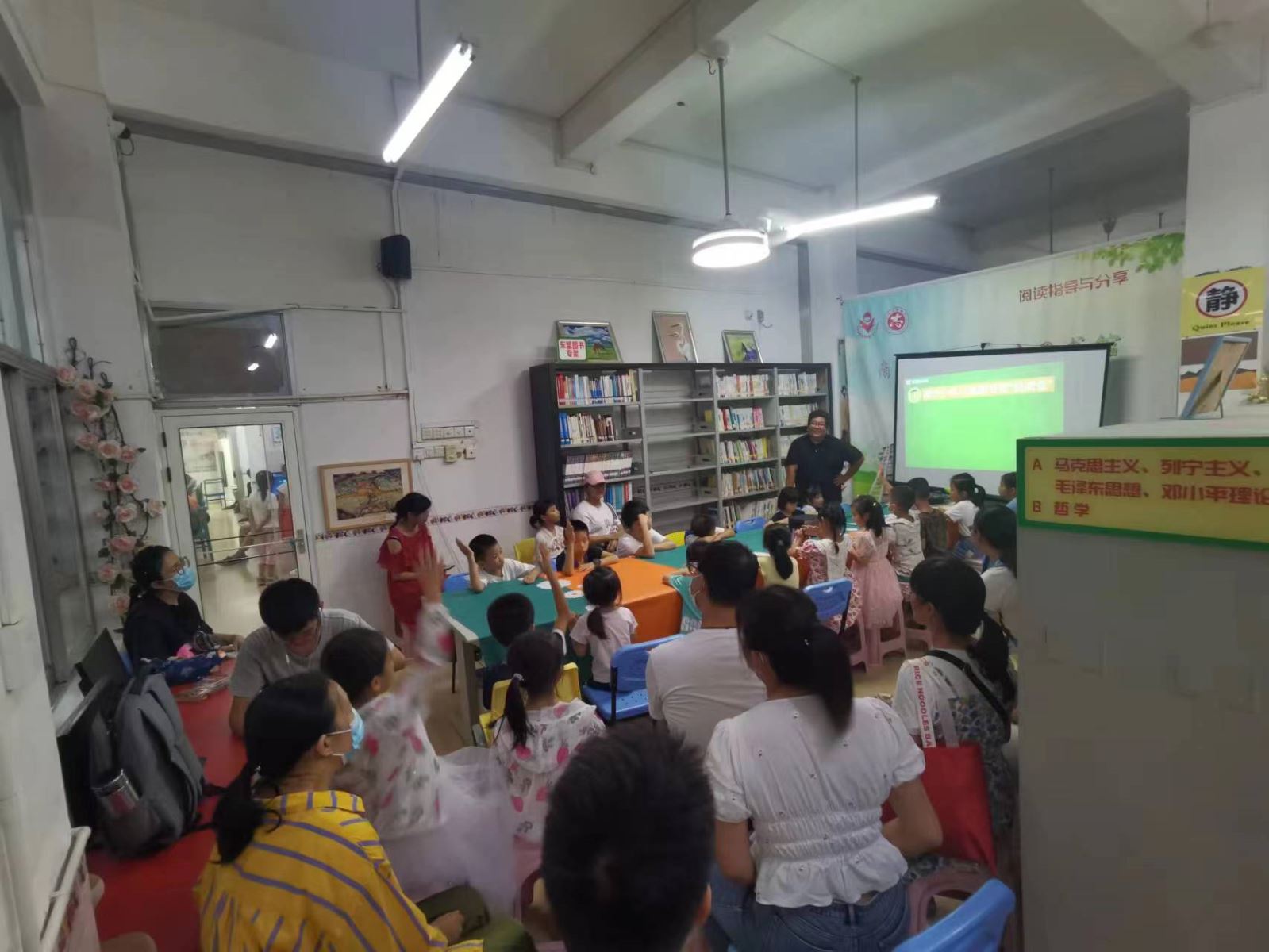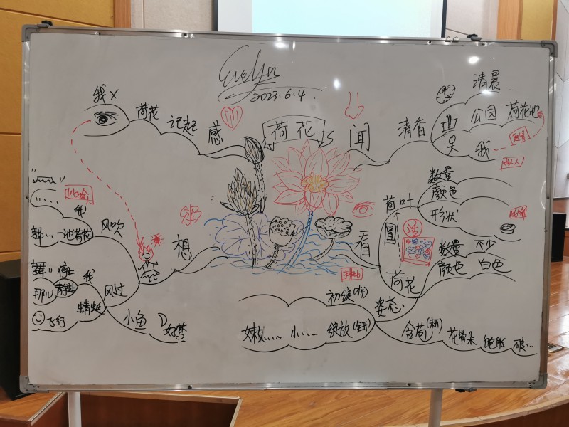 2023年6月4日悦阅会在三楼才艺展示厅进行,林曼倬老师给小升初的孩子带来思维导图入门课第一课,好想方法可以让人事半功倍,林老师用风趣的语言和有趣的游戏深入浅出讲述了思维导图的含义和特点,孩子从后排移到前排,家长也放下了手机,听入了迷,最后还在老师的指导下作出了叶圣陶《荷花》的思维导图,32人参与活动