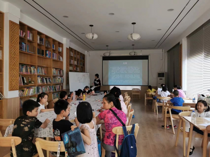 2023年7月8日二楼湖畔书吧悦阅会,小刘老师带大家巩固思维导图训练,以《月光曲》为例,用开始、发展、高潮、结局来给课文分枝干,归纳提炼,画导图,25名孩子参与活动