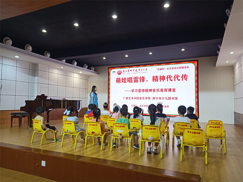 2024年3月24日下午多功能厅,悦阅会开展主题为"萌娃唱雷"的音乐美育课堂,来自广西艺术学院音乐学院的志愿者通过共读雷锋故事、同唱歌颂雷锋精神歌曲《学习雷锋好榜样》的互动方式,与18名孩子共同度过了有意义的一堂课。生动有趣的课堂进一步增强少年儿童的担当意识,提升孩子们学习雷锋精神的热情
