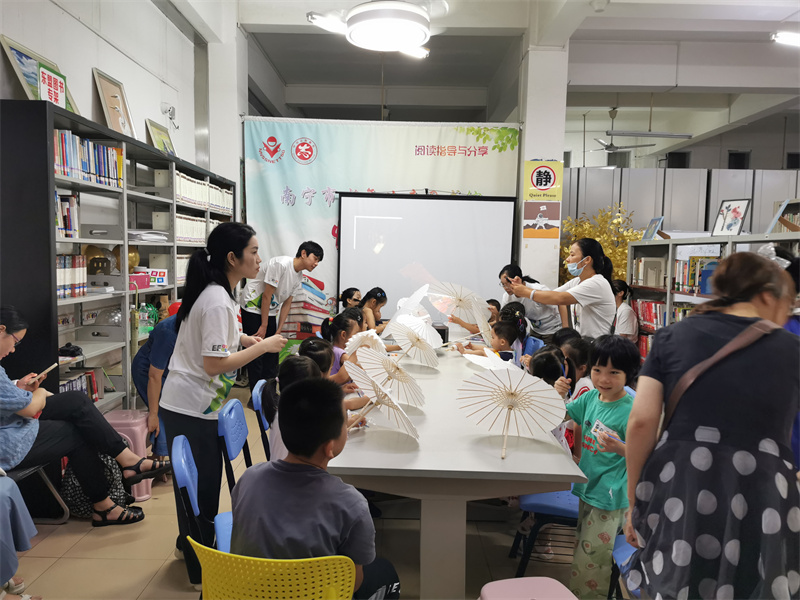 2024年8月3日,第二次中华文化主题“非遗传承——油纸伞”英语角活动开始,通过观看英语短片、玩游戏等方式,认识“paper”、“oil”、“bamboo”等单词,并在油纸伞上描绘自己的喜欢的图案