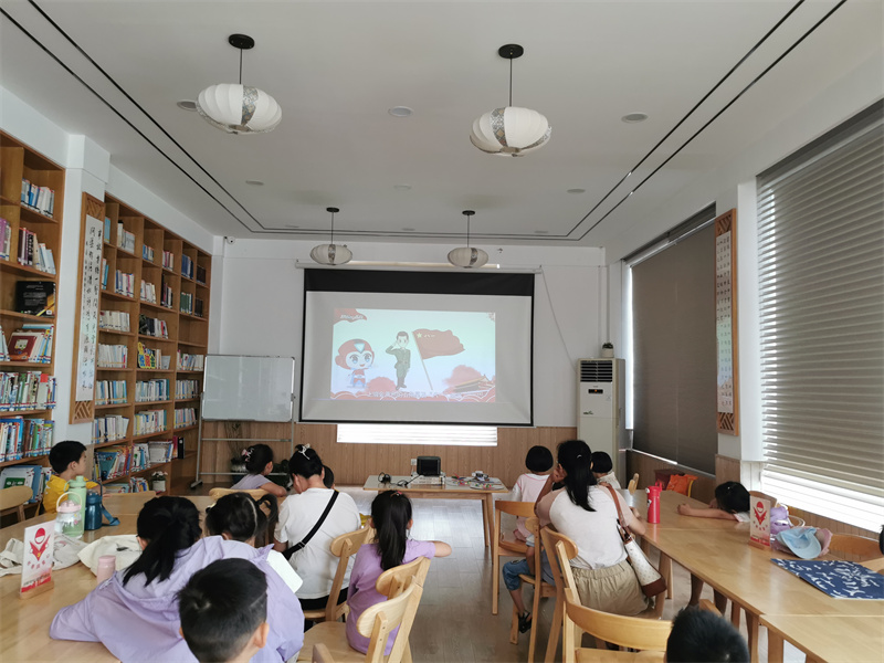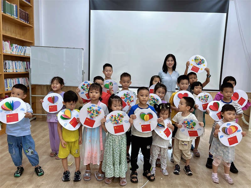 2024年8月10日上午,尧尧姐姐通过《我要更自信》《乌云之上有晴空》《小海螺与大鲸鱼》等故事,告诉大家每个人都是珍贵的独一无二的个体,小小的身体也能做出大能量的事情,勇敢自信地做自己吧。讲完故事看宣传片了解建军历史和“八一”精神,最后一起做手工献礼八一
