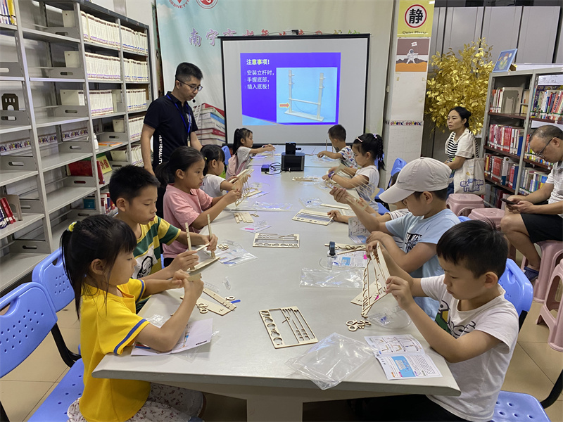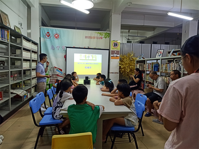 8月11日下午四点一楼教参室,悦阅会科普读物推荐和小制作活动组织15名小读者学习制作机械手。本次小制作的实验重点是认识四边形的不稳定性,了解简易机械手的组成部分以及设计到的原理知识。孩子们在游老师的指导下,制作出能模仿人手和臂的某些动作功能的“机械手”,可以进行简单的抓取、搬运物件或操作。成品有趣有意义,孩子们都非常喜欢