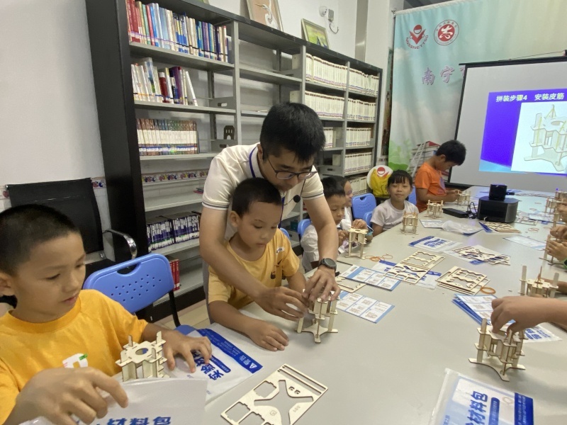 2024年10月13日,15位读者在游老师的指导下制作蒸汽减震器,它利用橡皮筋的弹力来缓和衰减震动,来保护装置中的物体。老师还推荐读者们课后可以借阅馆内《科技史脱口秀》《玩具坊》《万物里的科学-柠檬》等书籍