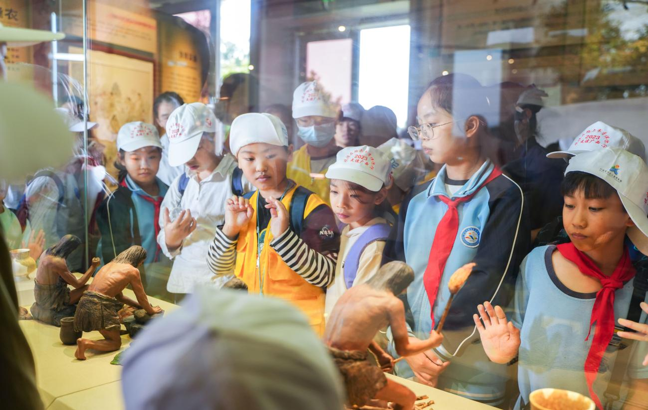 第一篇章“古文化探寻之旅”,读者走进南宁市顶蛳山遗址博物馆,开启珠江流域新石器时代贝丘文化的探寻之旅。遗址位于邕宁邕江支流八尺江右岸,占地5000多平方米,植被葱郁,让小读者尽享清新怡人的田园风光。博物馆展厅里保存了距今约7000年的新石器时代晚期古人类遗址,有石器、骨器、蚌器、畜力、干栏式建筑等。“渔猎采集天堂”的互动课堂,通过影视短片来模拟展示古人类的生活片段,种田、采集、蒸煮、祭祀、娱乐,让小读者流连忘返,屏息凝视。“古文化探寻之旅”将枯燥的史前历史以丰富的艺术形象、趣味的生活故事呈现在小读者面前,让小读者跳脱出时空枷锁,通过“视、听、说、动”来和古人类对话,体会古人类的生存智慧,激励自己生生不息。