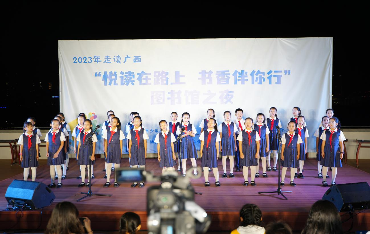 第三篇章“星空下的图书馆”,读者走进南宁市少年儿童图书馆,开启书香伴你行的阅读之旅。儿童图书馆始建于1988年,三十余载积累的推广经验和图书资源,为小读者营造了良好的阅读氛围。晚会于25日晚间举行,邀请了南宁、北海、钦州三地的少年儿童共同演绎十个节目。作为“星空下的图书馆”晚会举办地,儿童图书馆的顶层经过美化修整,变得焕然一新,崭新的木质地板、迷你的露营帐篷、摇曳的花卉装饰、古韵的茶房、迎风而立的舞台,仿佛在向小读者们欢迎致意,让整场晚会衬托出青春舞动的气息。合唱《萱草花》,感生命之无常,清澈的嗓音传递出对亲人刻骨铭心的思念和期盼。朗诵《红船精神》,忆革命峥嵘岁月,铿锵有力的誓词展现出共产党人前赴后继、不懈奋斗的精神谱系。粤剧《红娘》,观小艺术家的生动活泼,丰富多样的表演形式发扬了岭南地区的文化传统。十个节目各有特色、内涵丰富,让小读者们感受优质的图书馆服务,把图书馆的服务范围扩大到文化浸润,打响“悦读在路上 书香伴你行”图书馆之夜的研学品牌。