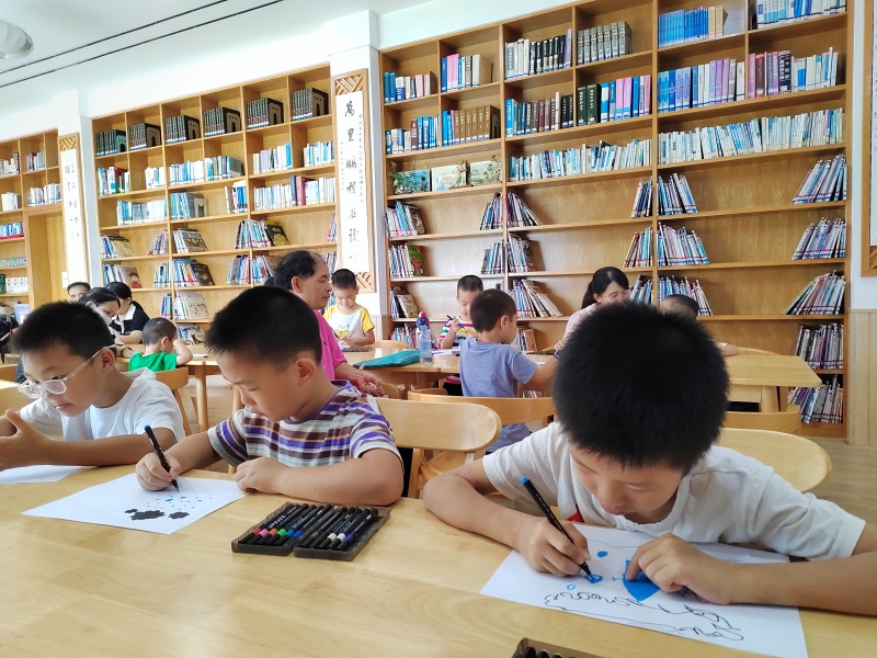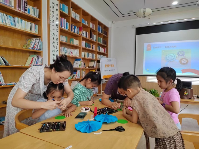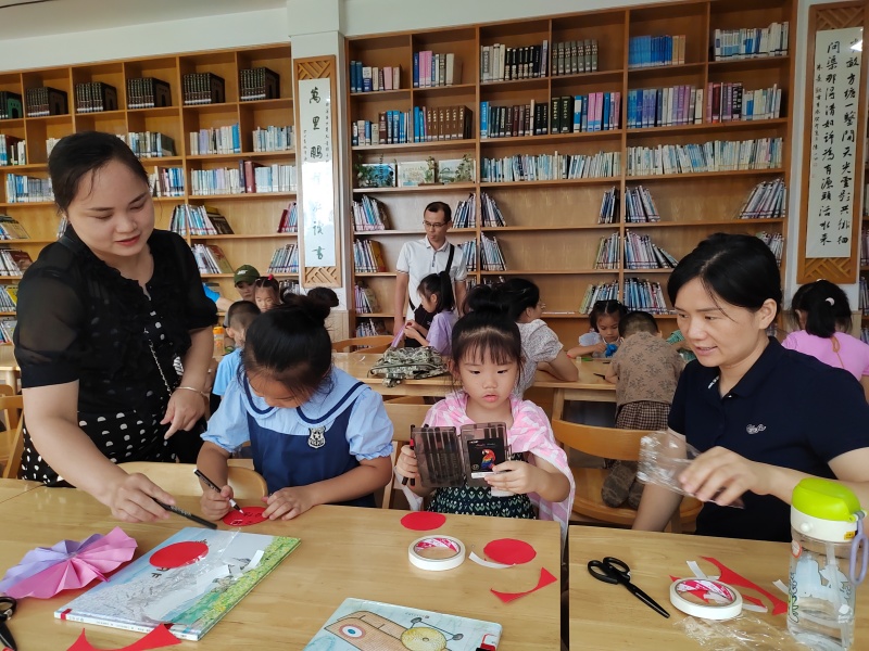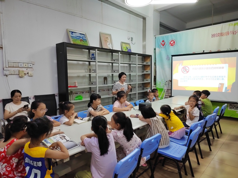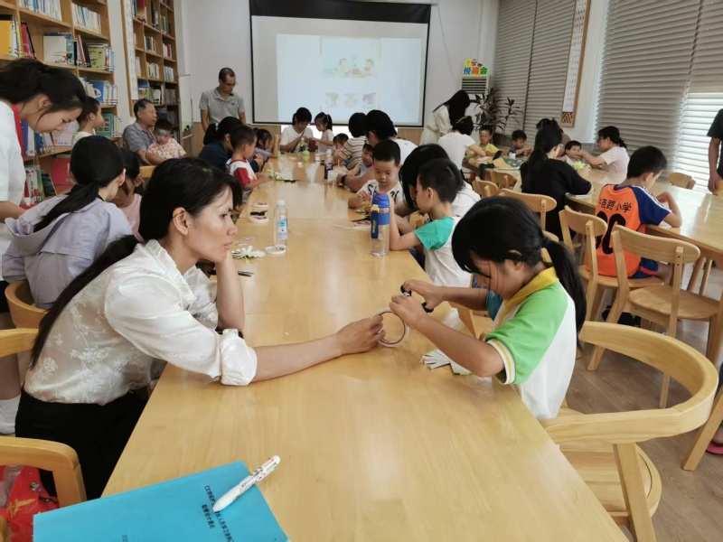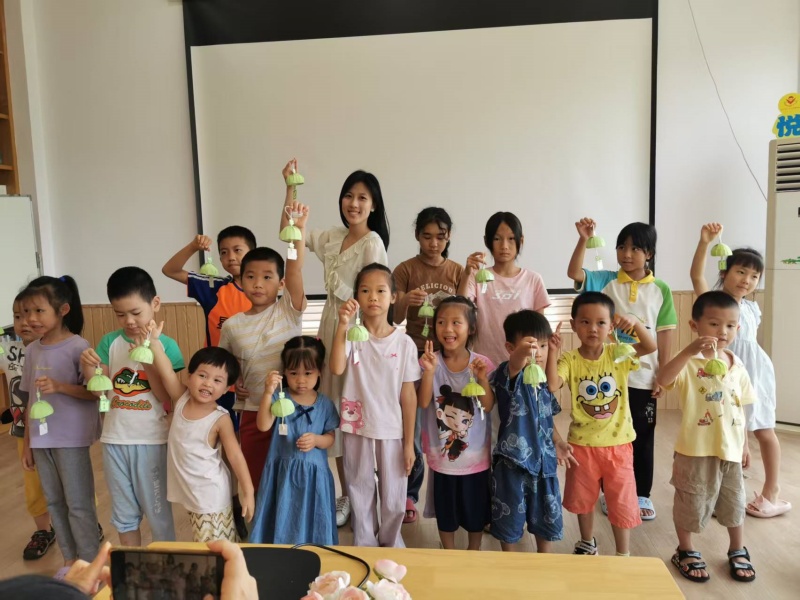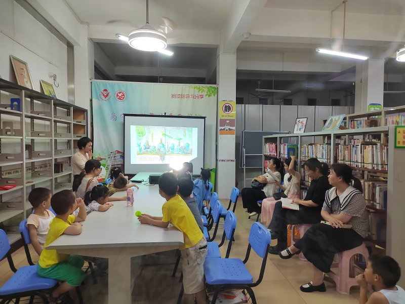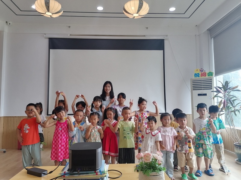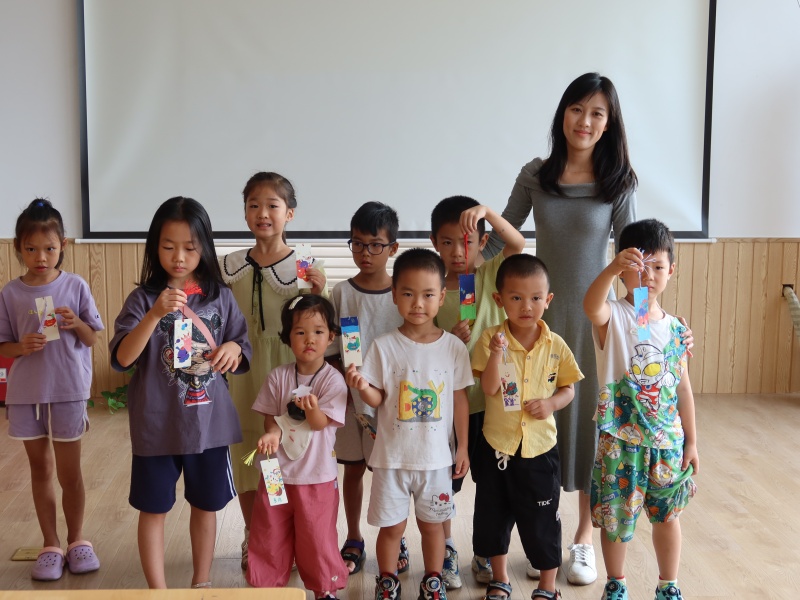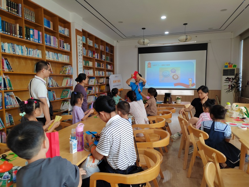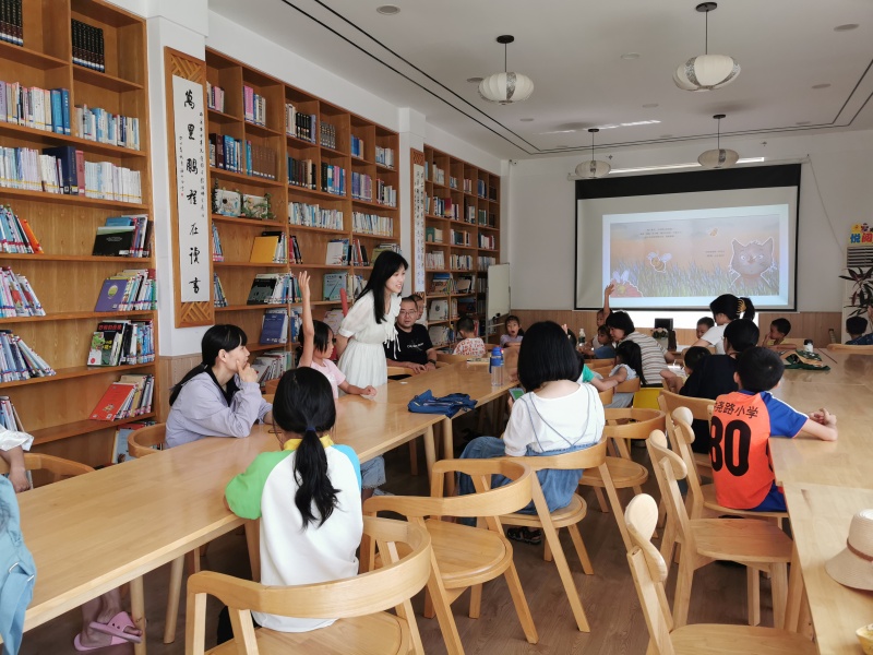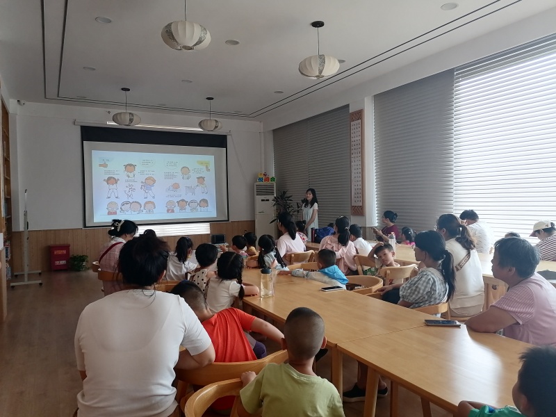 2025年7月26日二楼湖畔书吧悦阅会,小姚老师分享绘本《魔法的夏天》,讲述两个城市孩子到乡下度假的经历,孩子们也分享这个时节有什么天气、什么水果、什么玩乐项目,炎炎夏日也可以妙不可言,最后一起制作了风铃