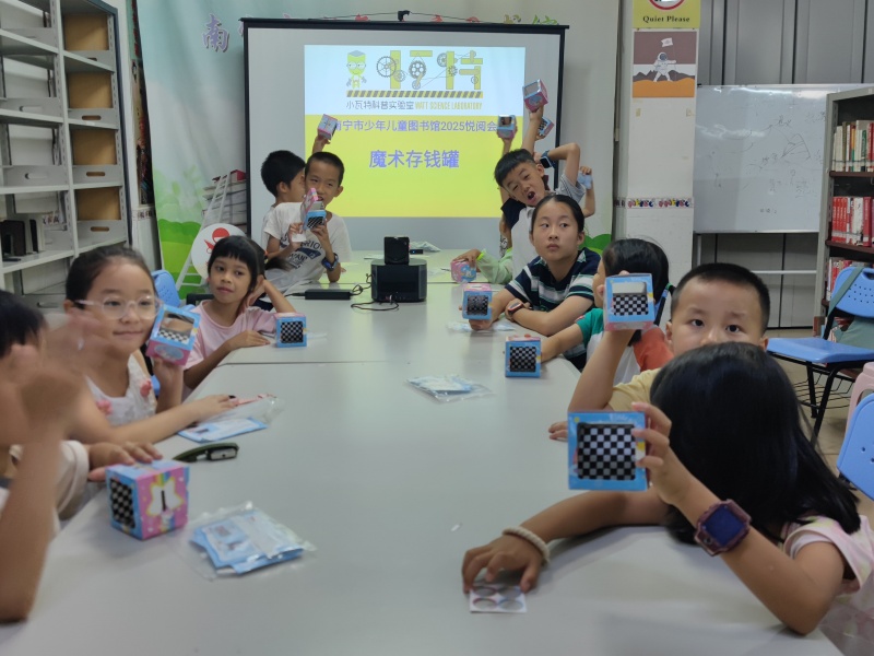 悦阅会百科工坊,游老师带领小朋友们制作魔术存钱罐,利用镜子反射光原理,把下方黑白格背景反射至上方,实像与虚像结合,形成“空筐”效果;投进去的硬币,实际掉入镜子后面,既是科学家又是魔术师,好玩得意犹未尽